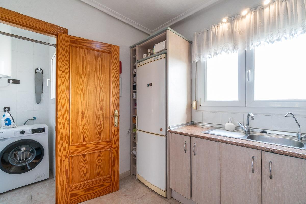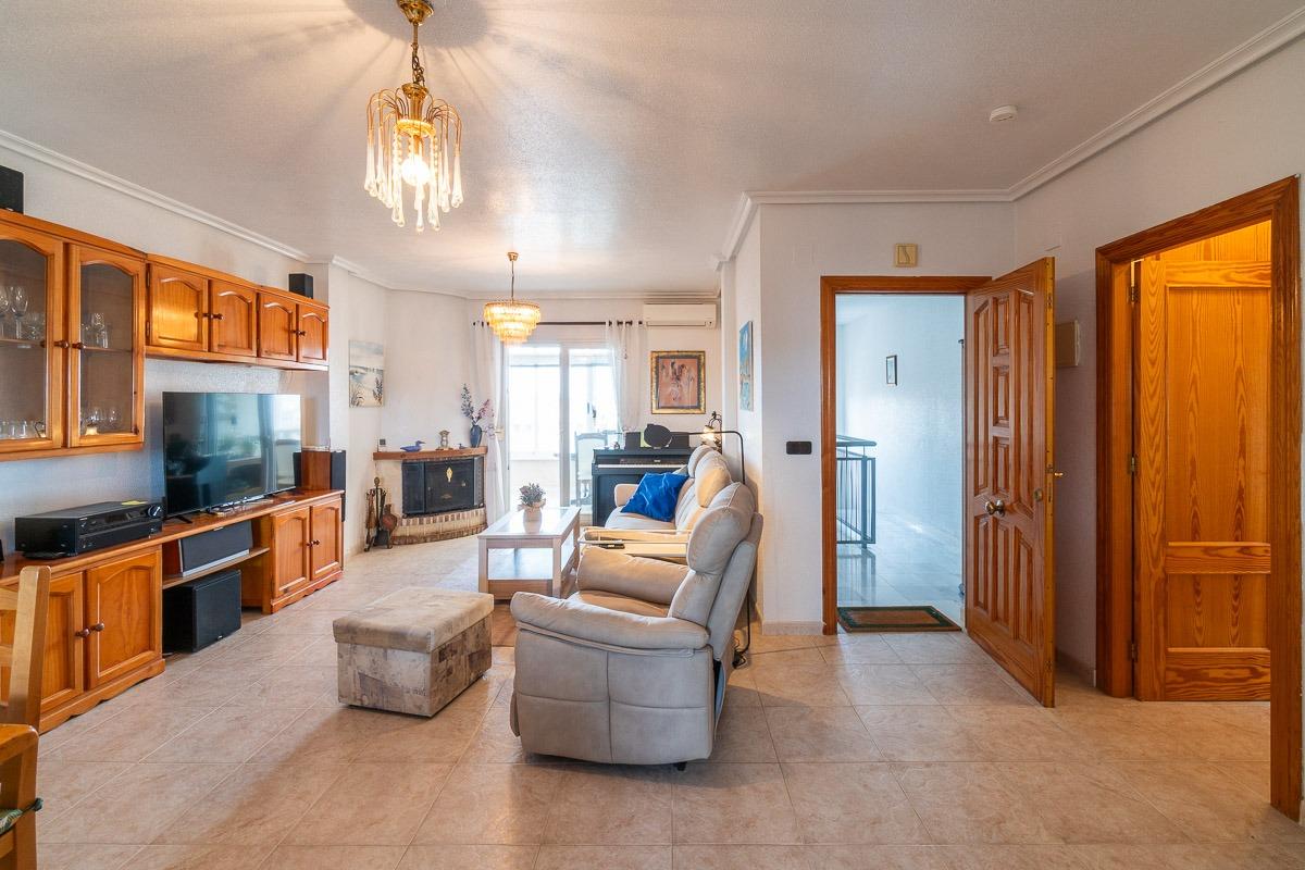 Precioso, amplio y luminoso ático con vistas espectaculares en el corazón de Playa Flamenca donde además de sol todo el día puede contar con más de 120 m2 y un garaje doble para vehículos y trastero, para Usted y su familia.~~La zona en Playa Flamenca donde se encuentra es perfecta, ya que se encuentra a una corta distancia andando del centro comercial Zenia Boulevard, de zonas deportivas municipales, colegios, tiendas, zonas de ocio y claro está, a 10 minutos de las mejores playas de Orihuela Costa.~El residencial está vallado y cerrado con puertas automáticas de acceso de vehículos, y cuenta dentro de él con parking donde dejar su coche en la calle, con una piscina olímpica, de 25×12 más jardines alrededor de la misma, y amplias zonas de aparcamiento para vehículos.~~La vivienda es muy amplia y abierta, con una terraza principal con un cierre de aluminio y cristal orientada al Sur y sol todo el día prácticamente, para en invierno tenerlo cerrado y mantener la temperatura y calentar toda la vivienda con el calor del cierre de aluminio, pero además, por tener ventanas a ambos lados de la vivienda, se pueden abrir y tiene la brisa que refresca el ambiente durante los meses de calor y abriendo las ventanas del cierre, la casa queda bien ventilada y fresca. Desde todas las ventanas se tiene una sensación de independencia y privacidad ya que es la vivienda más alta de la zona y no está sobrevista por ninguna otra propiedad.~~El ático tiene un muy buen tamaño, prácticamente 120 m2 construidos, con un hermoso salón-comedor con chimenea, una cocina amplia con barra de desayuno y una despensa-lavadero, tres grandes dormitorios con armarios empotrados, el principal con cuarto de baño on suite, y un segundo cuarto de baño completo para el resto de la vivienda. Desde cualquier lugar tiene una sensación de amplitud y espacio.~~Además del parking en la calle junto a la vivienda, donde de forma más provisional dejar su vehículo para poder dejar la compra y subir directamente a la propiedad, también cuenta con su propio garaje cerrado con puerta automática comunitaria y puerta privada con cerradura donde dejar de forma permanente su vehículo, o bicicletas, o usarlo como trastero de forma segura y cómoda.~~Cuenta con calefacción radial bajo el suelo, está amueblado, en perfecto estado de conservación y listo para entrar a vivir en la misma.~~Merece la pena una visita a la propiedad para comprobar todas sus ventajas y disfrutar de todas ellas.~~~