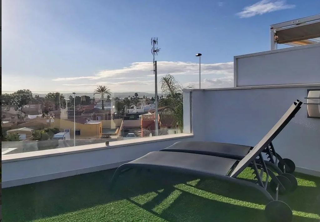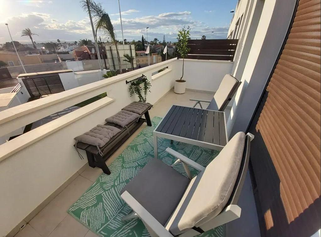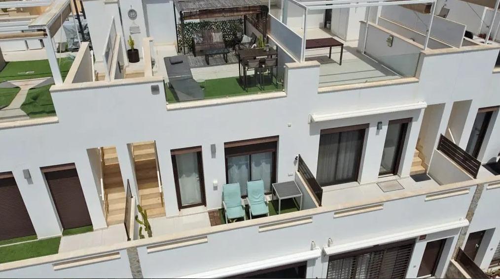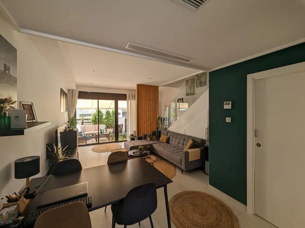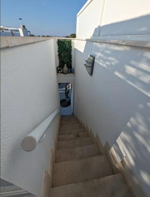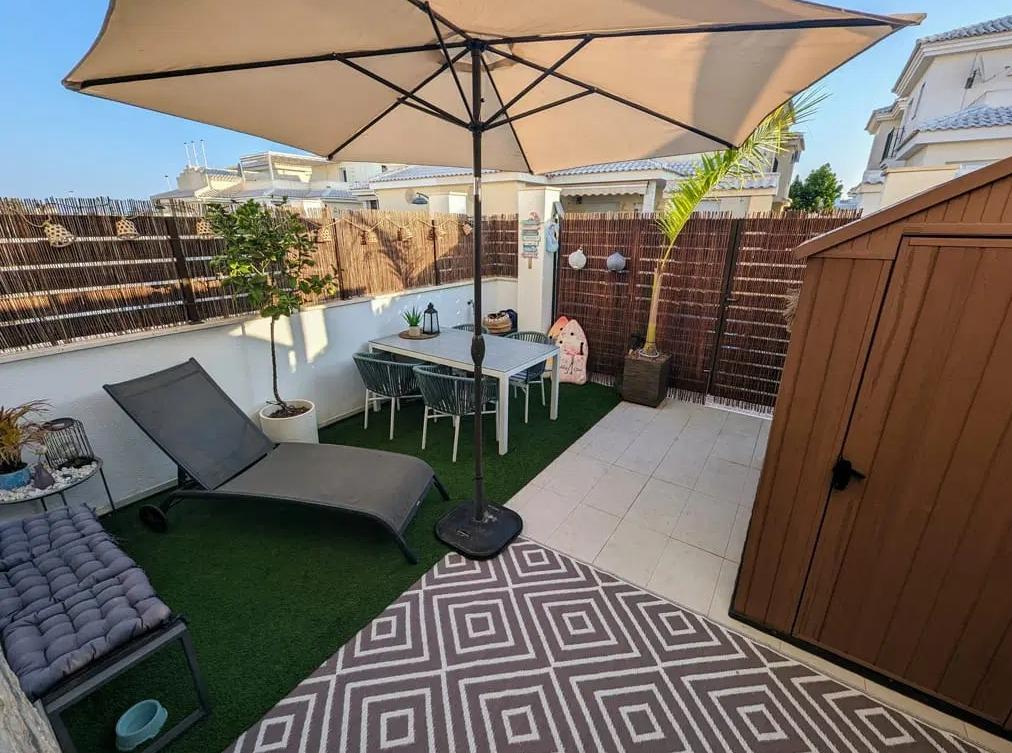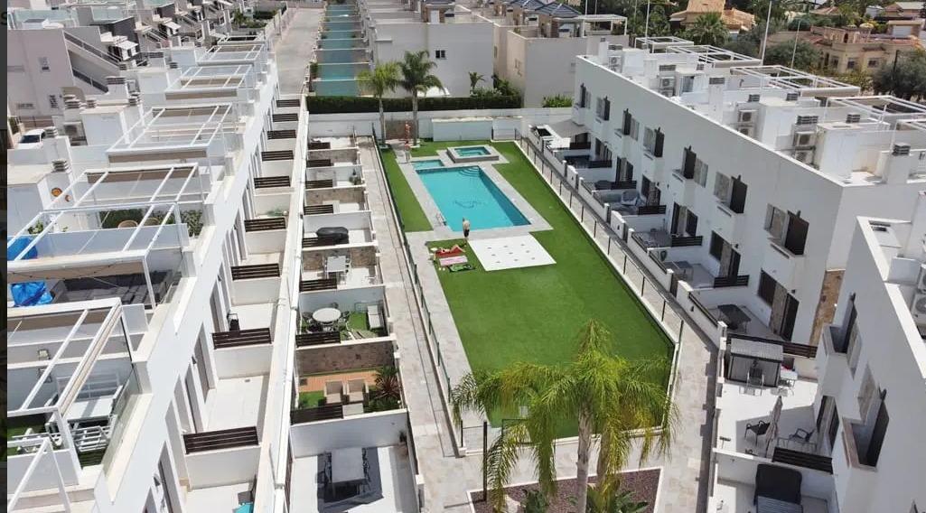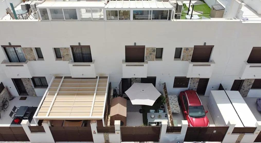 Duplex en venta en Torrevieja de 3 dormitorios 2 baños, urbanización, en piscina comunitaria.~~La casa tiene una ubicación tranquila y muchas comodidades a poca distancia. La residencia consta de 32 viviendas. Hay un bonito jardín comunitario con piscina, piscina para niños, jacuzzi y zona para tomar el sol.~~La casa tiene una hermosa terraza orientada al sur adyacente al salón. La puerta corredera del salón consta de 3 piezas con cristal de suelo a techo. Esto permite que entre mucha luz. En la planta baja se encuentra el salón, la cocina abierta, 1 dormitorio y 1 baño con ducha y WC. Desde la cocina hay una puerta exterior a la terraza orientada al norte. Aquí podrá aparcar su coche en su propia propiedad o en la calle cerrada. En el salón hay una escalera abierta con un trastero debajo que sube al primer piso. En el 1er piso hay 2 dormitorios y un baño con ducha y WC. En el pasillo hay una puerta exterior al balcón, el balcón está ubicado al sur y en invierno es maravilloso quedarse aquí. A la fantástica terraza de la azotea se accede a través de la escalera exterior. La terraza de la azotea tiene una cocina exterior cubierta, un trastero, un armario cerrado para la lavadora y el calentador de agua y, por supuesto, suficiente espacio para relajarse con una fantástica vista del lago salado.~~A 2 minutos a pie se encuentra el supermercado Economy Cash y muchos restaurantes agradables, varias pizzerías, un pub griego, uno indio, uno chino, uno irlandés y muchos más.~El hermoso y moderno centro comercial Habaneras se encuentra a 10 minutos a pie.~En poco menos de 20 minutos se puede caminar hasta el centro histórico de Torrevieja y el encantador bulevar también está a poca distancia.~~~~Características:~~Terraza planta baja orientación sur~Terraza planta baja orientación norte~Balcón~Terraza en azotea con cocina exterior y trastero cerrado.~Jardín comunitario~Piscina comunitaria (con piscina infantil y jacuzzi)~Residencia cerrada~Cocina con electrodomésticos incluidos~Baños completamente equipados con calefacción por suelo radiante.~Calefacción por suelo radiante en el salón.~Aire acondicionado instalado (LG – unidad individual por piso)~Armarios empotrados~Persianas enrollables eléctricas~Sombrilla eléctrica para terraza lado sur~Todas las ventanas y puertas de la planta baja están equipadas con mosquiteras.~Sistema de alarma instalado con detección interior y exterior.~Es posible aparcar en propiedad privada o en calle cerrada.~