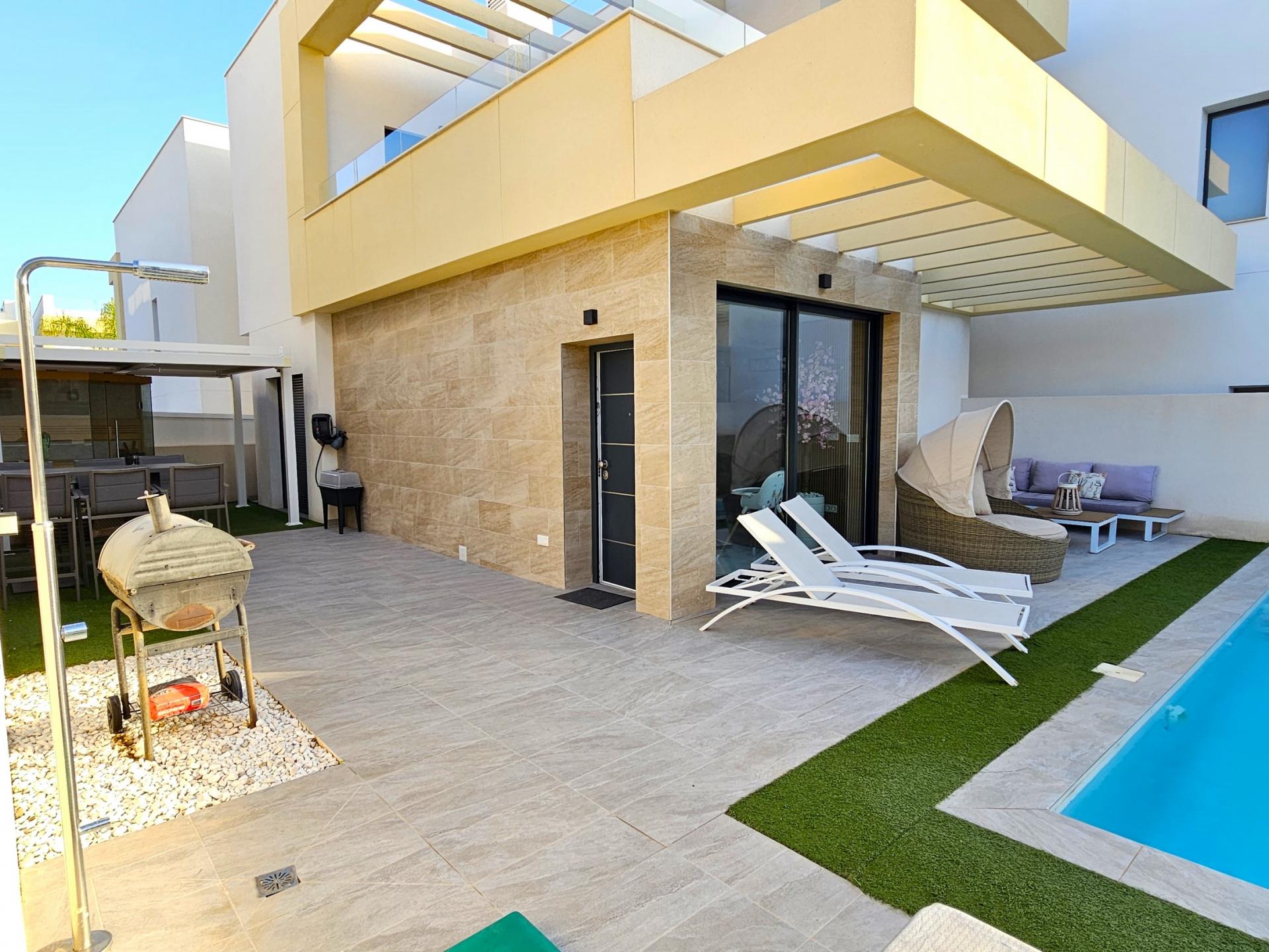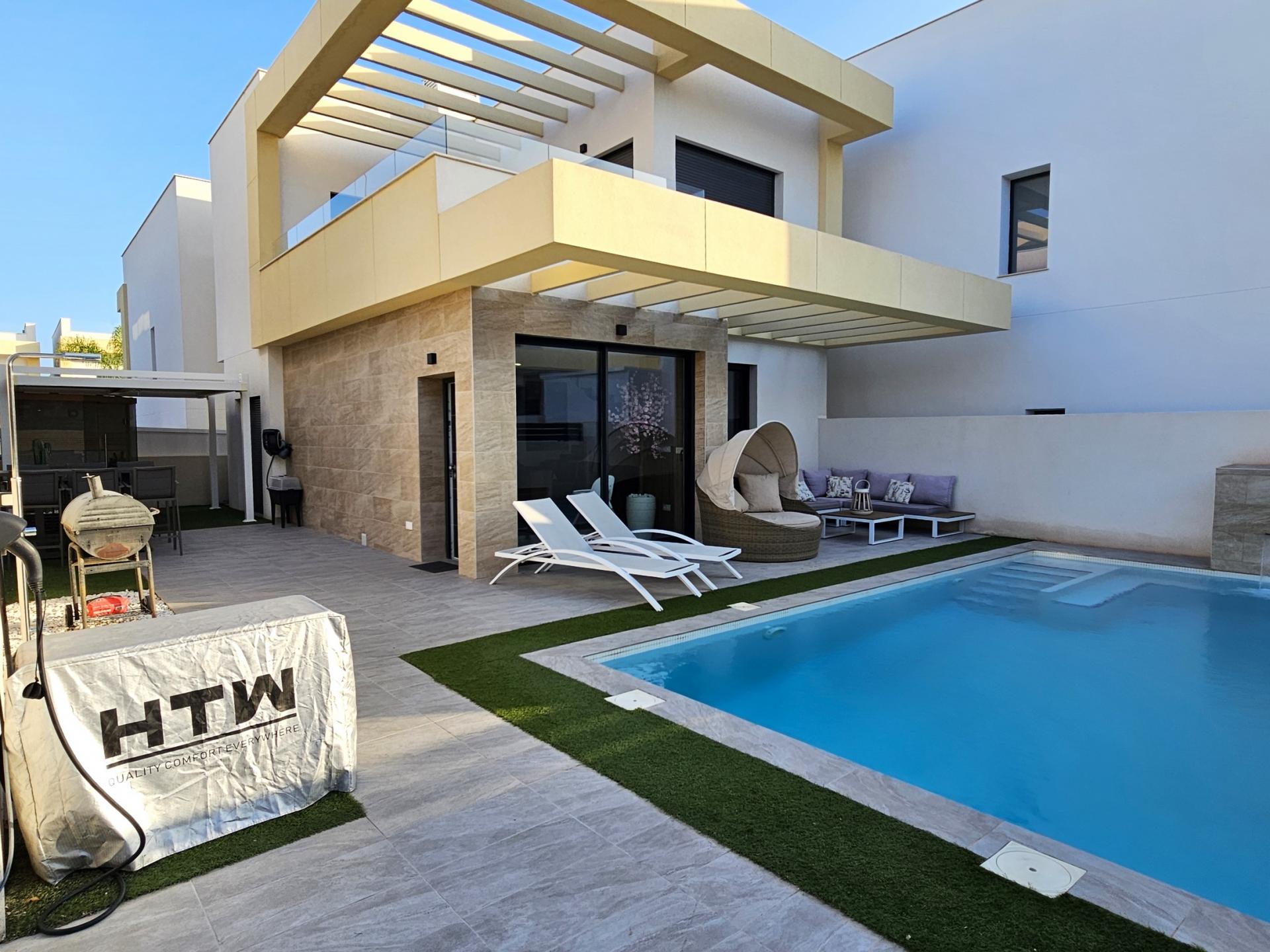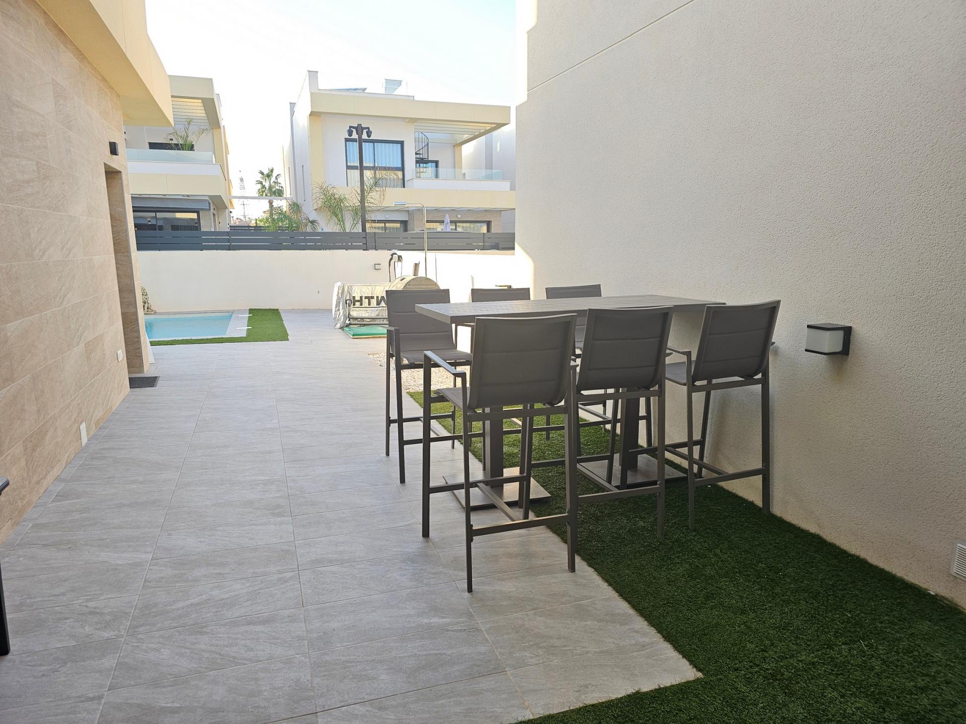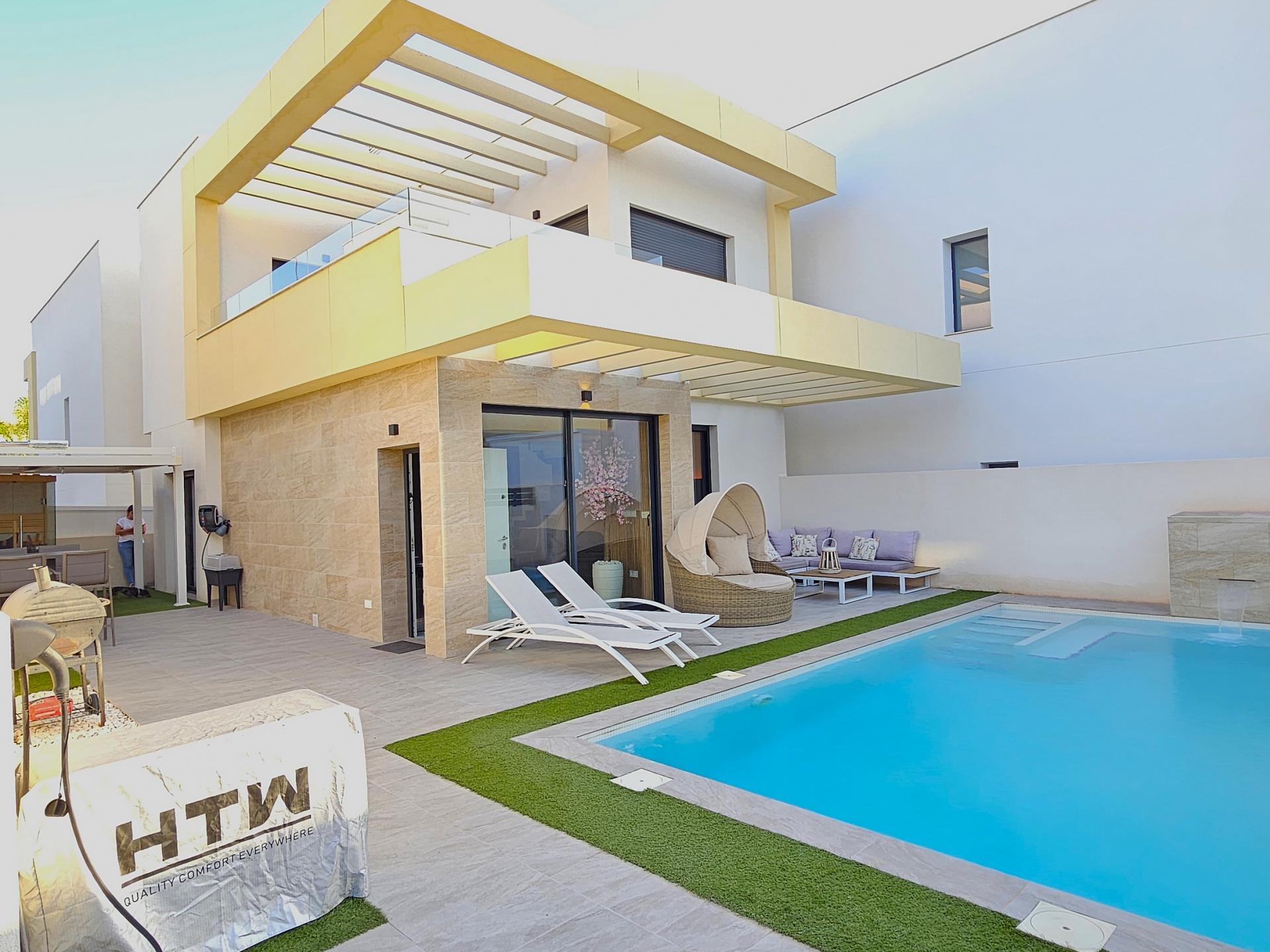 Villa moderna de 2023, completamente equipada con todo lujo de detalles, lista para entrar a vivir~~Villa completamente amueblada y equipada, lista para entrar a vivir con todas las características de alta tecnología con 3 dormitorios y 2 baños, 1 aseo preinstalado en el lavadero (donde colocamos el inodoro y la ducha si el cliente lo solicita).~~Construida en 2023 ubicada en Los Montesinos, La Herrada.~~Construidos 120m2~~Parcela 220m2~~Construida en 2023~~Parking privado~~A 15 minutos de la playa~~A 5 minutos del campo de golf~~A 30 minutos del aeropuerto de Alicante~