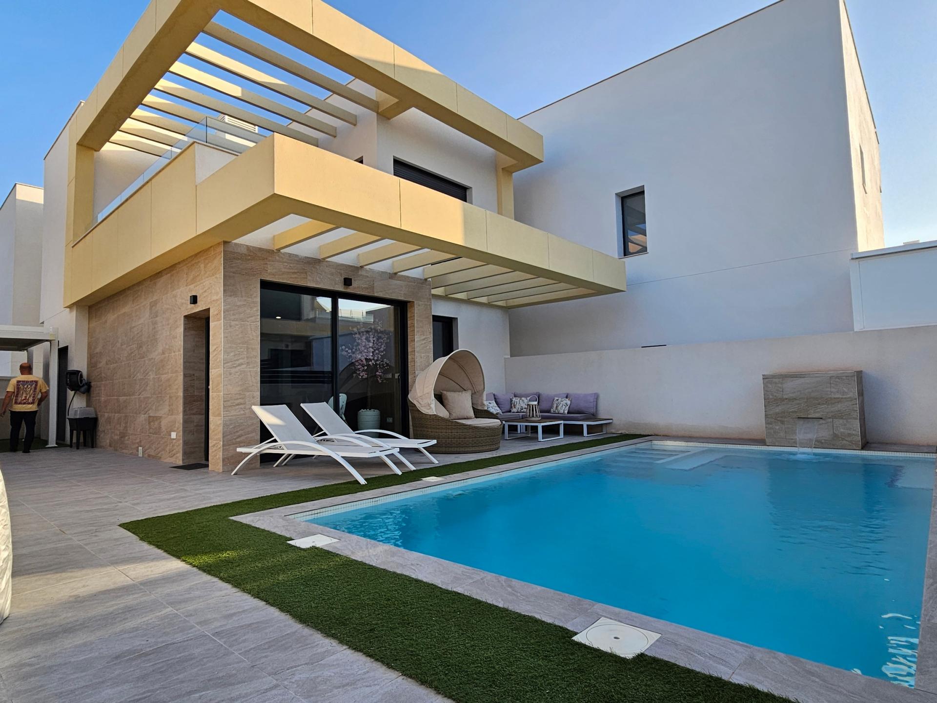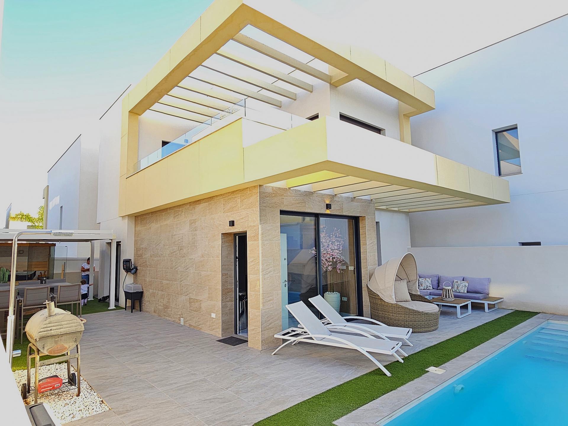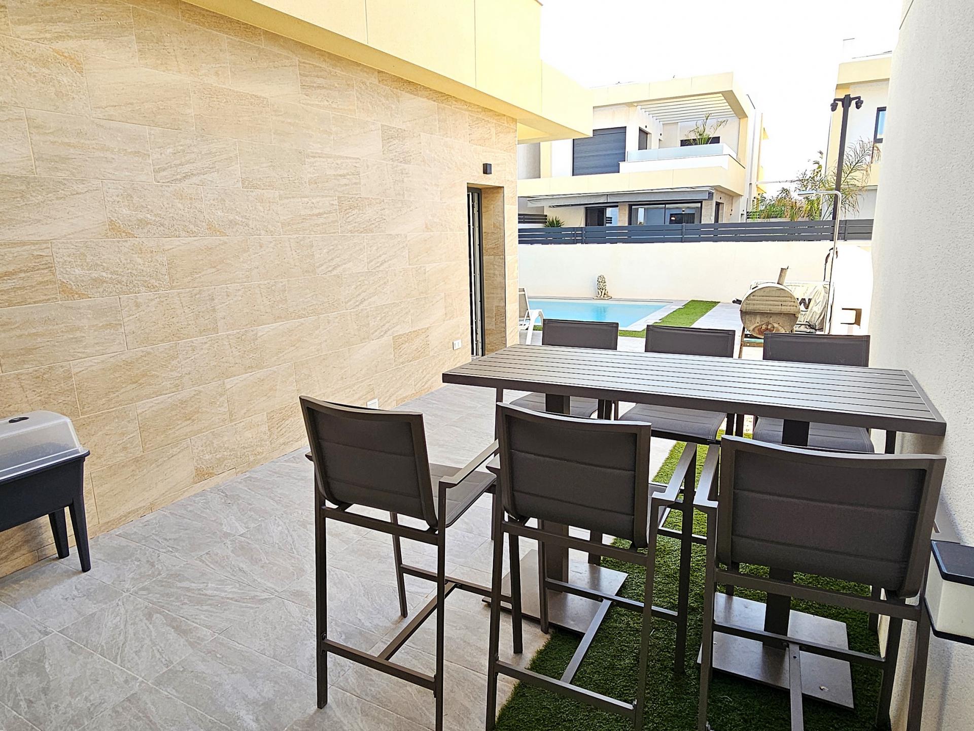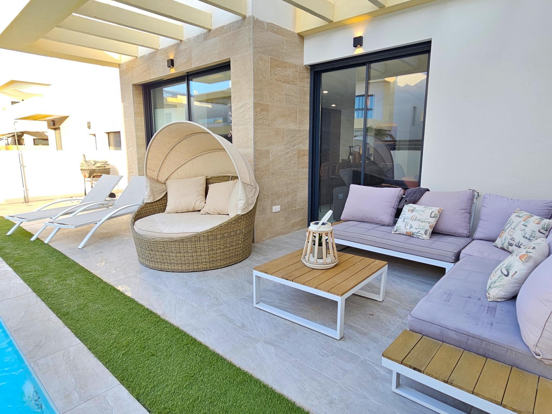 Villa moderna de 2023, completamente equipada con todo lujo de detalles, lista para entrar a vivir~~Villa completamente amueblada y equipada, lista para entrar a vivir con todas las características de alta tecnología con 3 dormitorios y 2 baños, 1 aseo preinstalado en el lavadero (donde colocamos el inodoro y la ducha si el cliente lo solicita).~~Construida en 2023 ubicada en Los Montesinos, La Herrada.~~Construidos 120m2~~Parcela 220m2~~Construida en 2023~~Parking privado~~A 15 minutos de la playa~~A 5 minutos del campo de golf~~A 30 minutos del aeropuerto de Alicante~