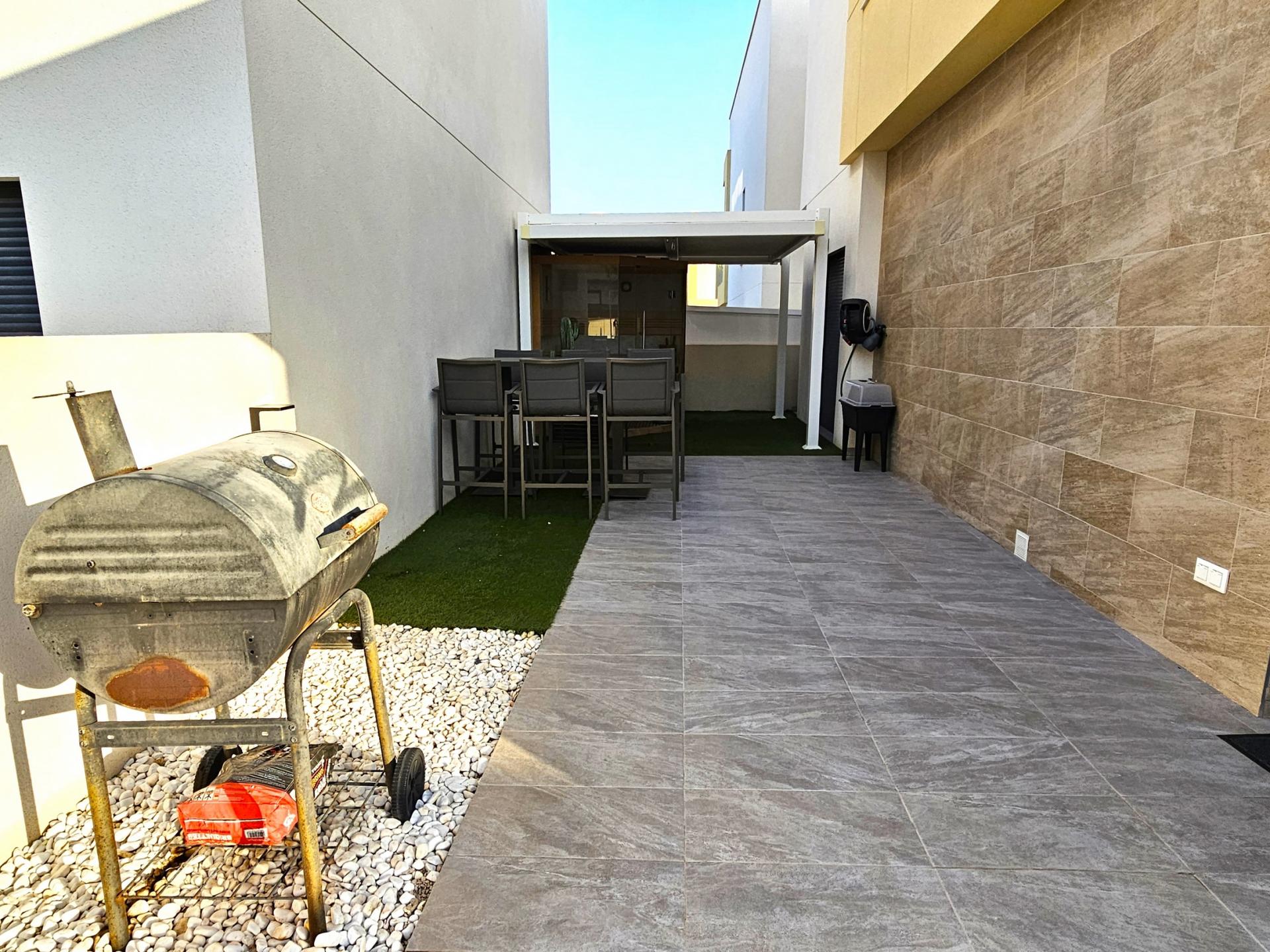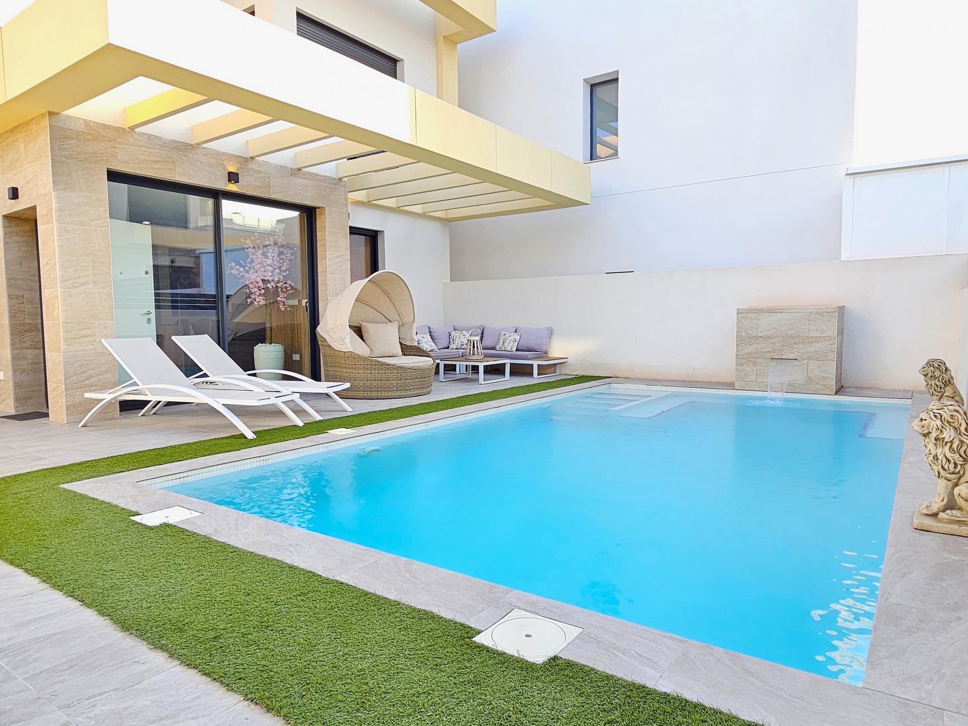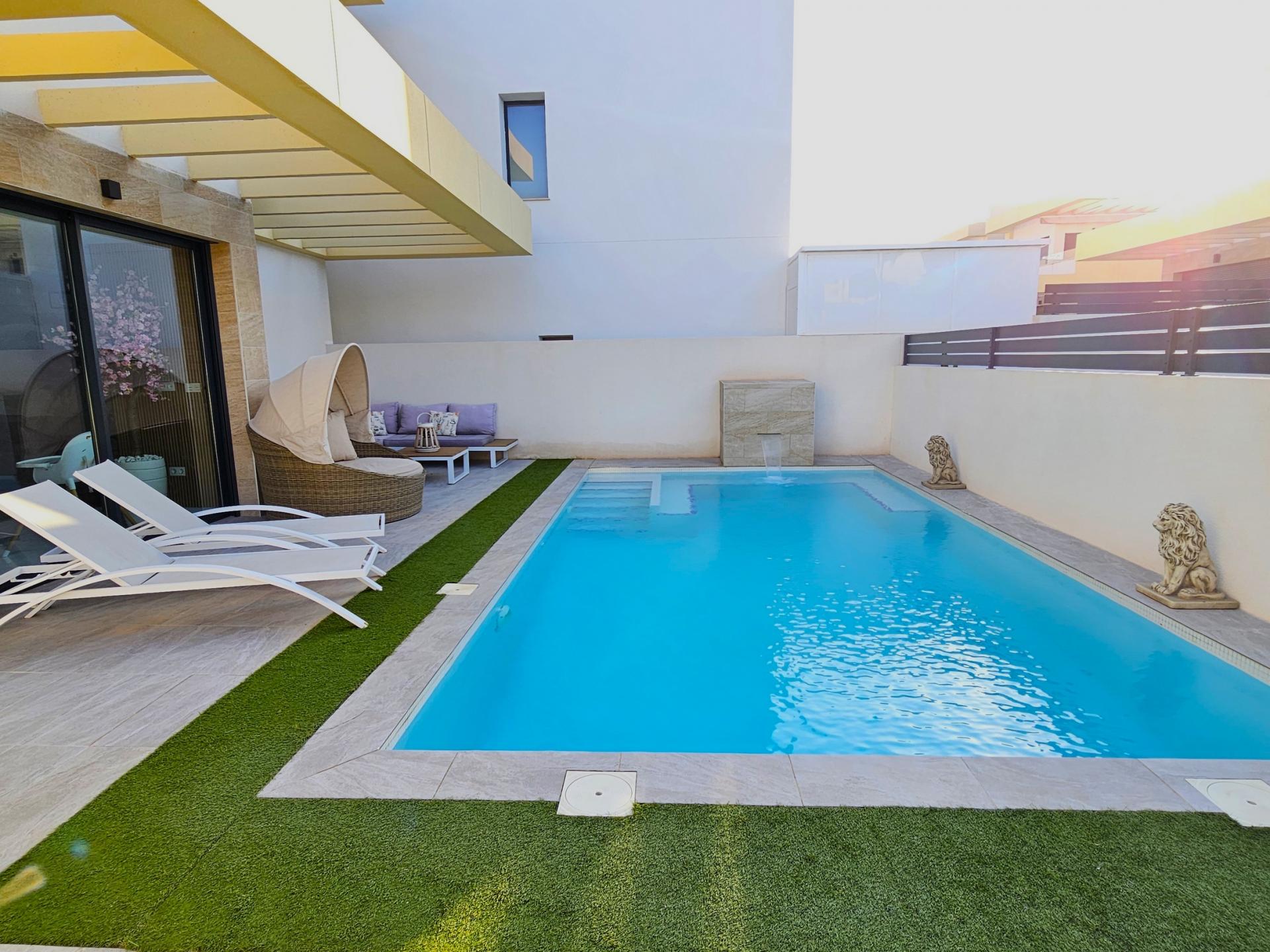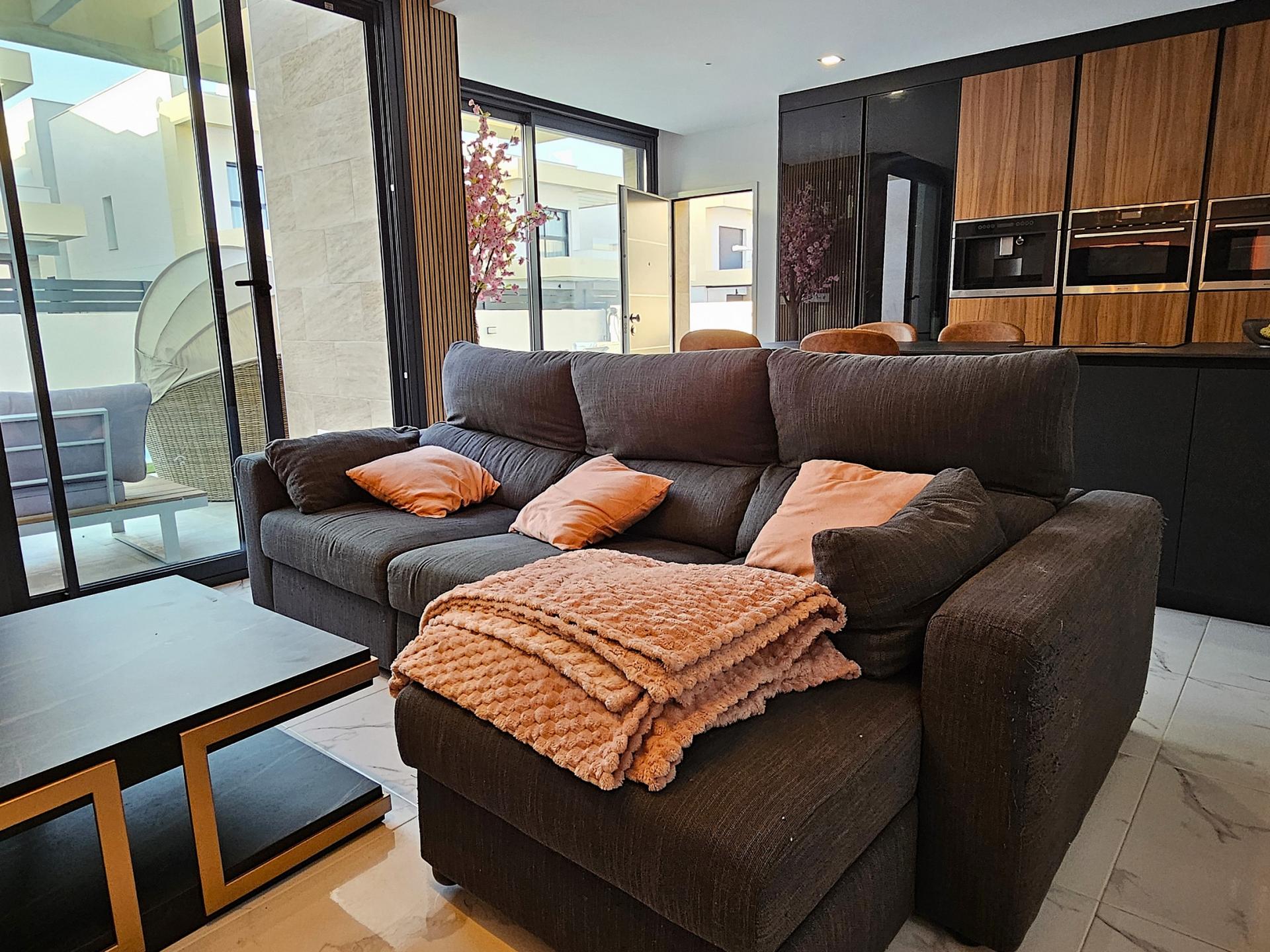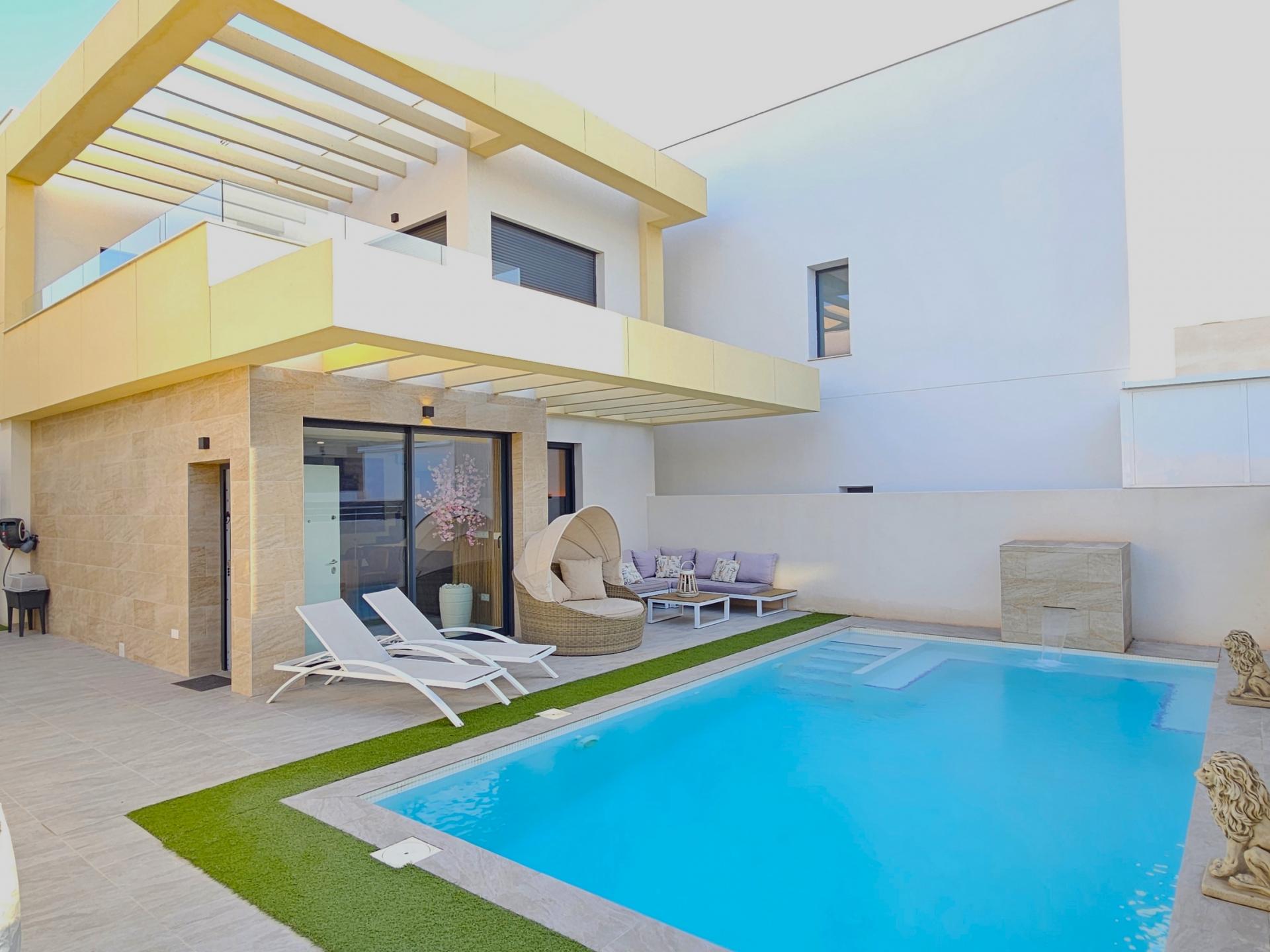 Villa moderna de 2023, completamente equipada con todo lujo de detalles, lista para entrar a vivir~~Villa completamente amueblada y equipada, lista para entrar a vivir con todas las características de alta tecnología con 3 dormitorios y 2 baños, 1 aseo preinstalado en el lavadero (donde colocamos el inodoro y la ducha si el cliente lo solicita).~~Construida en 2023 ubicada en Los Montesinos, La Herrada.~~Construidos 120m2~~Parcela 220m2~~Construida en 2023~~Parking privado~~A 15 minutos de la playa~~A 5 minutos del campo de golf~~A 30 minutos del aeropuerto de Alicante~